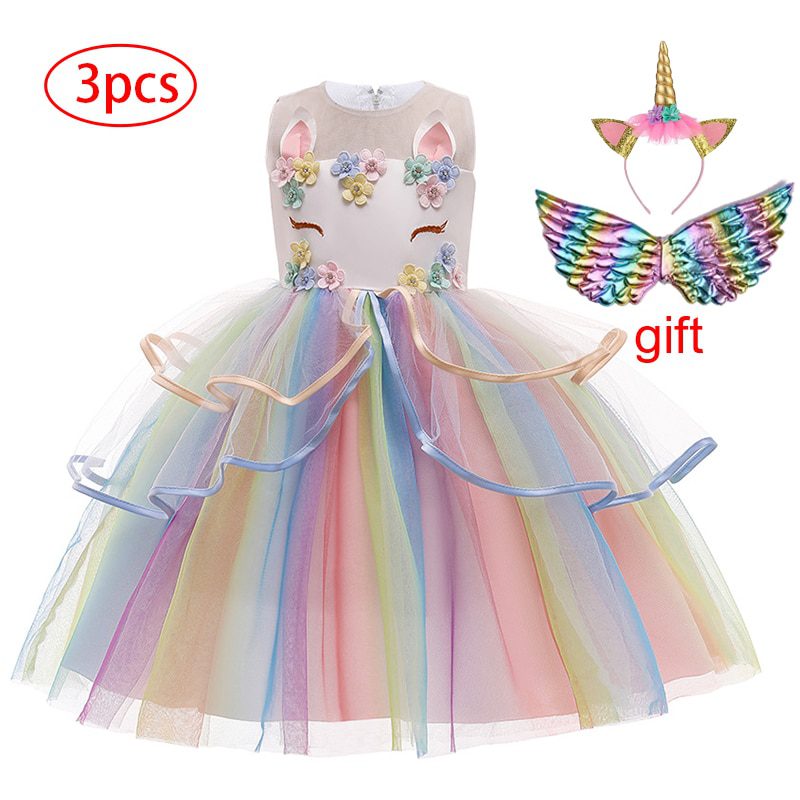 Robe de soirée d’anniversaire pour enfants, tenue licorne arc-en-ciel, motif floral, pour filles de 3 à 12 ans